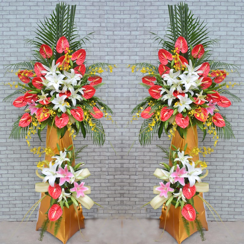 花 材:红掌2扎,香水百合2扎,散尾葵适量,两层花架,金箔纸包裹。
