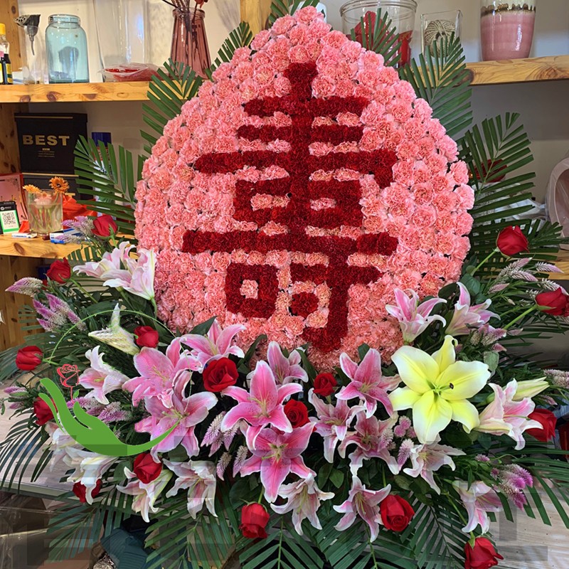 花 材:拼字造型呈寿桃状,粉色康乃馨外围环绕,红色康乃馨中间组成“寿”字,底座用红玫瑰、百合环绕,搭配散尾葵、绿叶等配花。