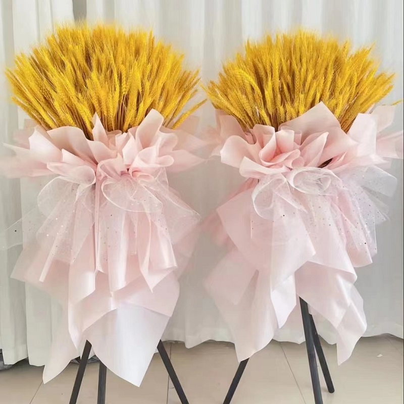 花材: 高档时尚仿真大麦、大麦,粉色雾面纸韩式包装,粉色网纱束扎。