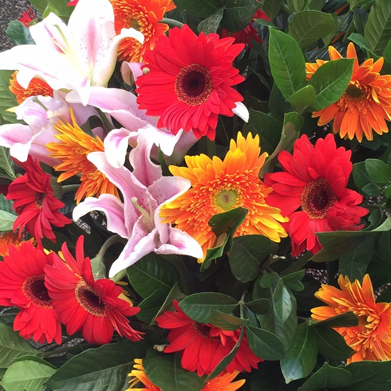 花 材:双色太阳花1.5扎,四朵粉色香水百合,栀子叶、散尾葵适量,玫红色棉纸包裹。