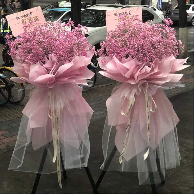 花材: 粉色满天星,粉色雾面纸内衬,白色网纱外包,香槟色花结。