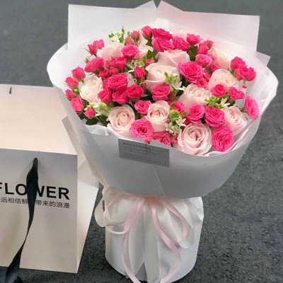 【爱在心窝】13枝粉玫瑰,8支多头苏菲宝贝,搭配白色蓝星花或白色满天星装饰。