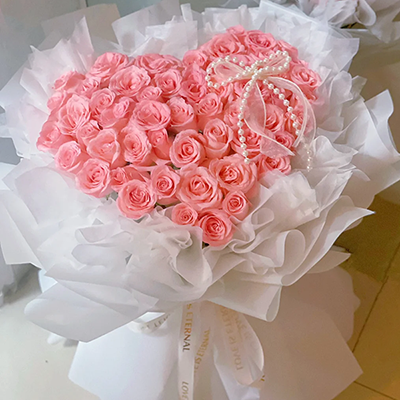 【恋恋物语】精选52朵戴安娜粉玫瑰,心形造型,珠串蝴蝶结装饰花面。