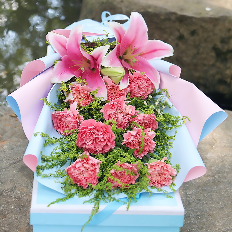 【粉红物语】11朵粉色康乃馨,4朵粉色香水百合,8支绿色洋桔梗,搭配尤加利叶装饰。