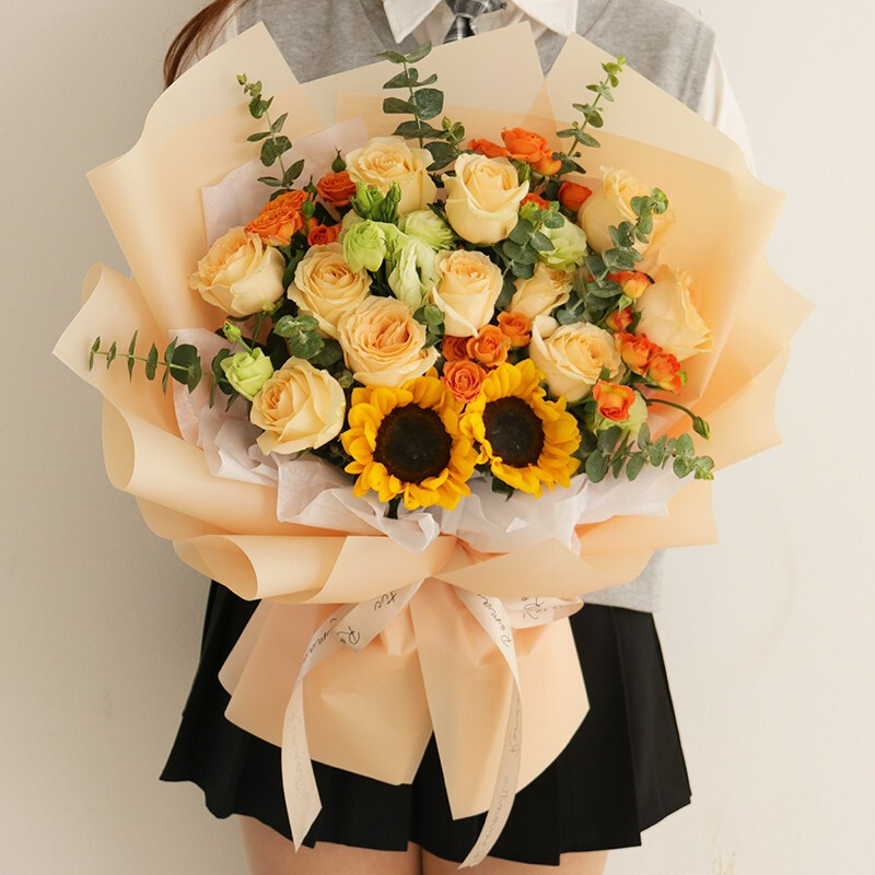 【静享慢时光】3支向日葵+9朵香槟玫瑰,搭配3支绿色小雏菊、适量银叶菊、栀子叶装饰。