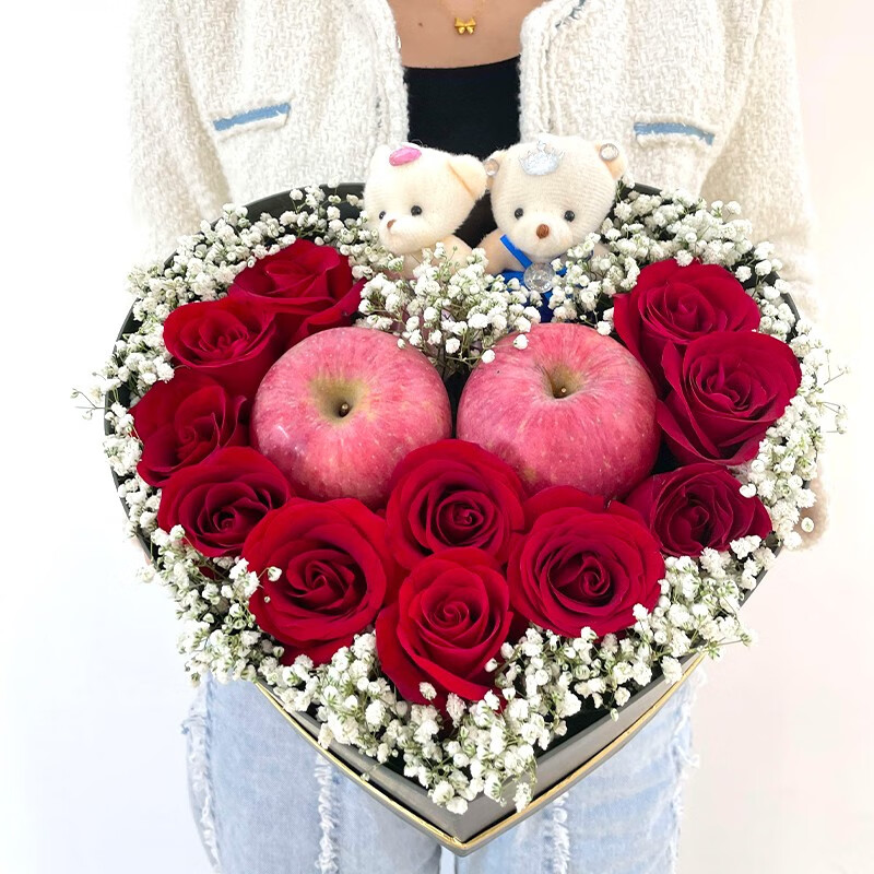 【美好祝福】11朵红玫瑰,2颗苹果,2只小熊,白色满天星外围环绕。