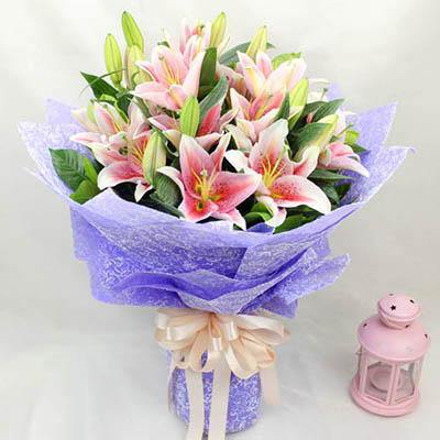 【心语心愿】精选18朵粉色香水百合,粉色满天星,小雏菊装饰。(小雏菊断货可用白色满天星、洋甘菊、洋桔梗代替)