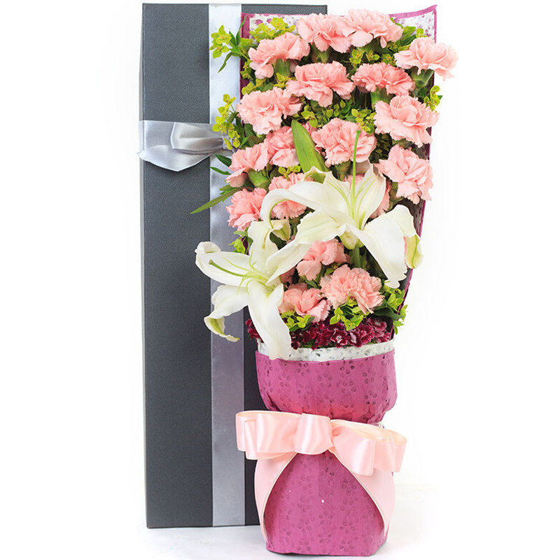 【良师益友】19朵粉色康乃馨,2枝多头白百合,搭配白色满天星,尤加利叶装饰。