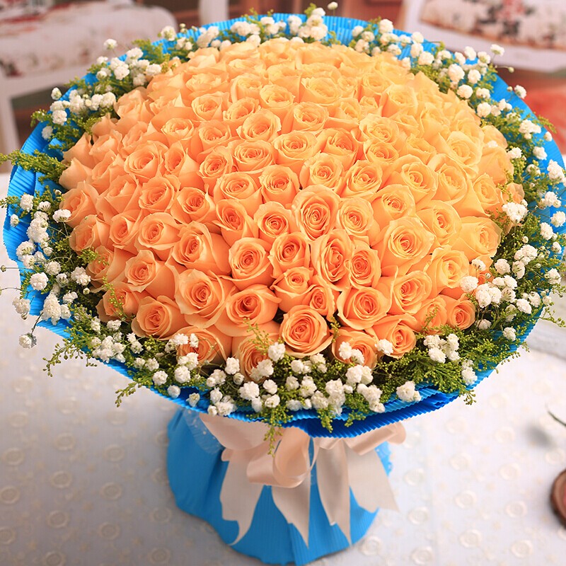 【我要你快乐】精选99朵香槟玫瑰,满天星外围点缀。