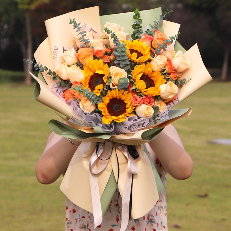 【欣欣向荣】精选2支向日葵,11朵香槟玫瑰,3支多头橙色小玫瑰,3支洋桔梗,搭配尤加利叶装饰。