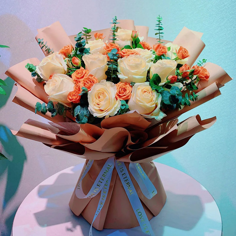 【遇见你的那一秒】11朵香槟玫瑰,6支多头橙色小玫瑰,搭配尤加利叶装饰。