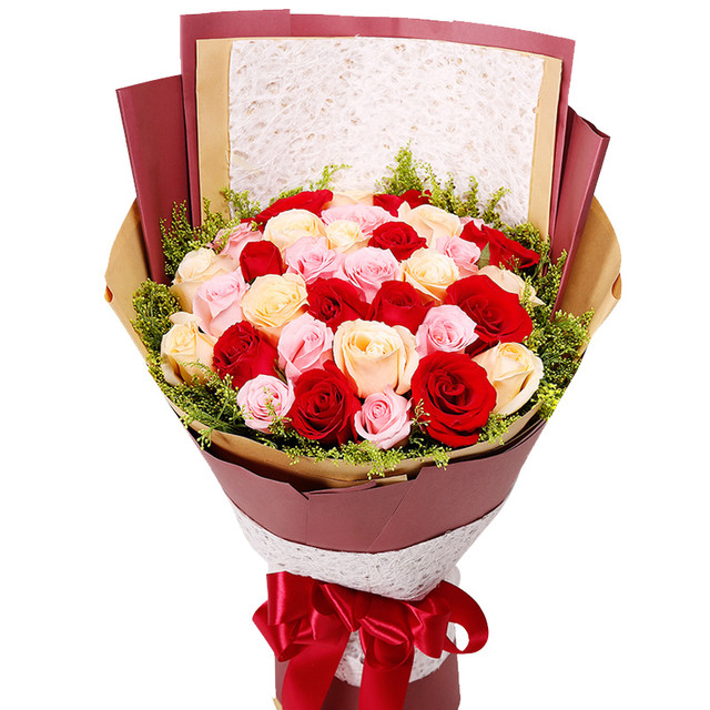 【1314-一生一世】33支混色玫瑰(5支香槟玫瑰+5支白玫瑰+11支红玫瑰+12支粉玫瑰),搭配适量栀子叶。