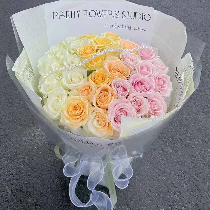 【光明未来】33朵渐变色玫瑰(白色、香槟色、粉色),搭配1条珠串。