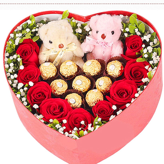 【甜蜜夏日】 9朵红玫瑰, 2只小熊 ,9颗费列罗巧克力,满天星、栀子叶搭配