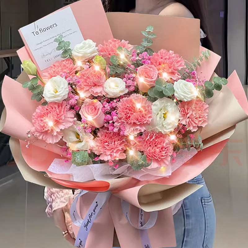 【温柔于你】粉色康乃馨、粉色玫瑰共11朵,4支洋桔梗,1条灯串,搭配粉色满天星,尤加利叶装饰。