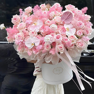 【粉色密语】1支粉色绣球,16朵粉色康乃馨,6朵粉玫瑰,11支白色洋桔梗(断货则用11朵白玫瑰代替),搭配桔梗、多头粉康、尤加利叶等配花装饰。