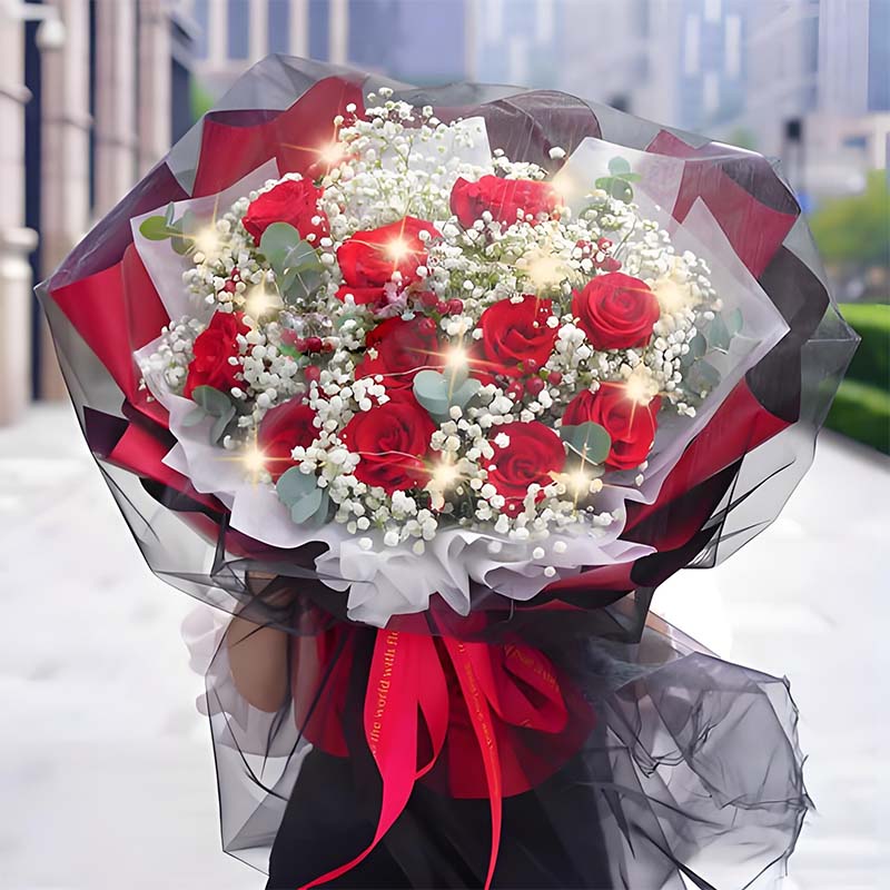 【黑夜之光】99支顶级红玫瑰,搭配皇冠、灯带装饰,满天星环绕。