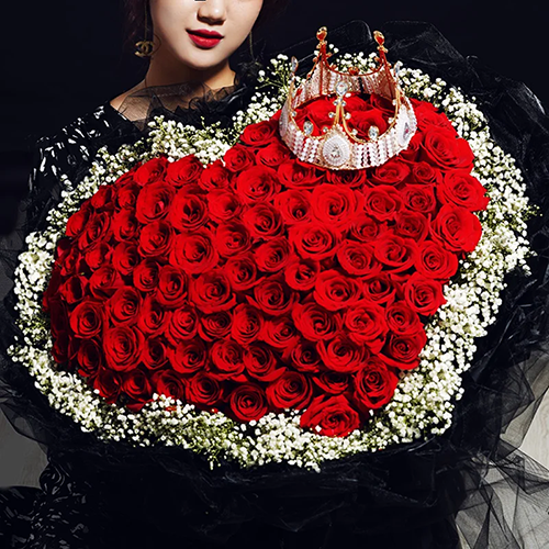 【世纪爱恋】99支顶级红玫瑰心形造型,1个皇冠(款式随机),满天星环绕。