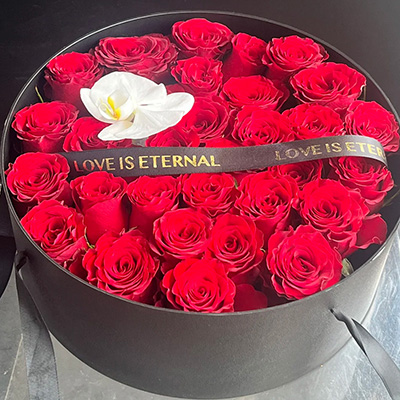 【想你在心里】精选33枝红玫瑰,1朵蝴蝶兰,黑色英文缎带装饰花面。