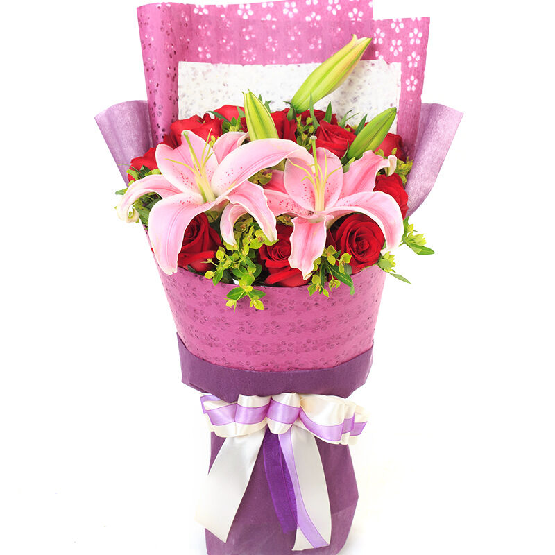 【不负韶华】红玫瑰、粉玫瑰混搭共11朵,白色、粉色多头香水百合共8支,搭配洋桔梗、尤加利叶装饰。