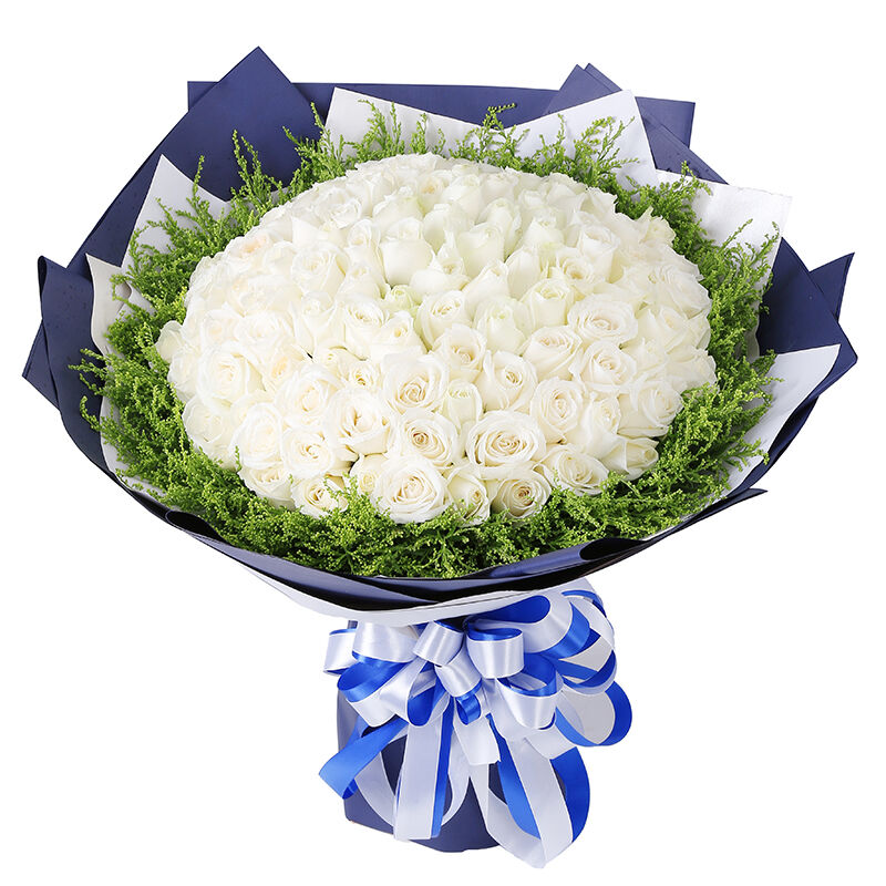 【幸福花语】精选99朵顶级香槟玫瑰,白色满天星环绕。