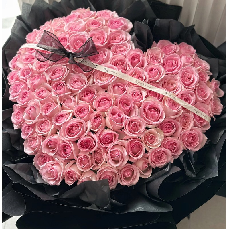 【情投意合】精选99朵粉玫瑰,1条缎带系蝴蝶结装饰花面。