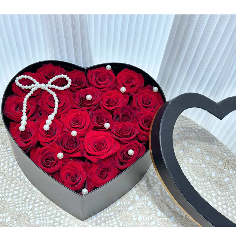 【浓浓情深】精选24朵红玫瑰,1条珠链系蝴蝶结,搭配珍珠钉装饰花面。