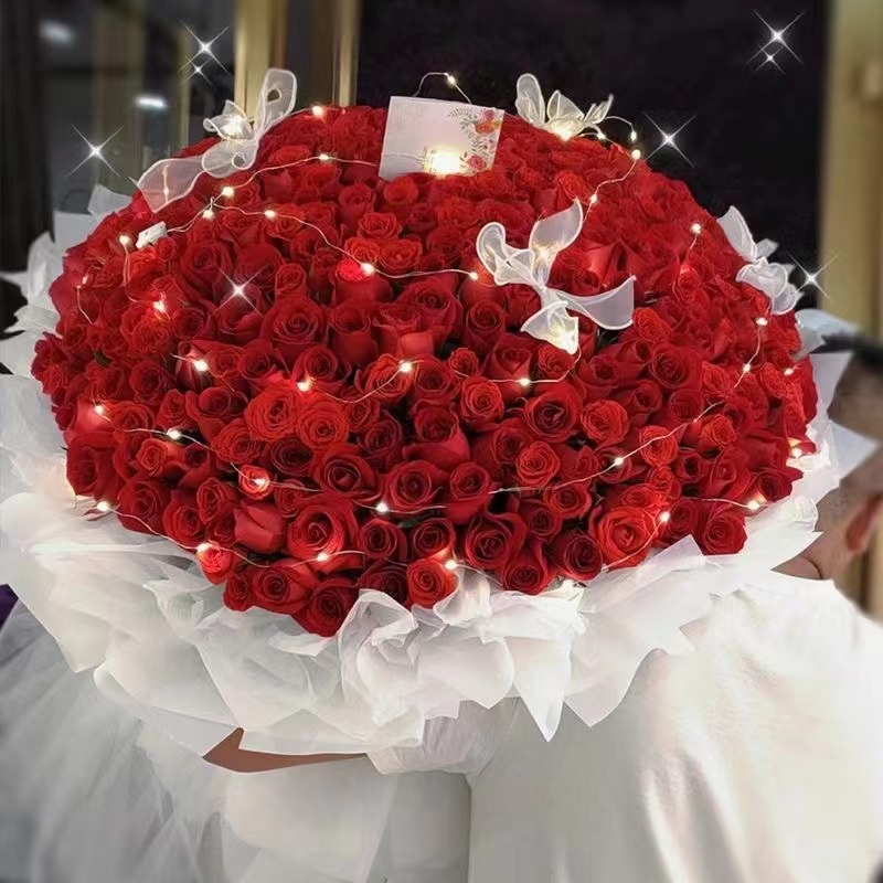 • 【相约永恒】365朵红玫瑰,蝴蝶结、灯串装饰花面。