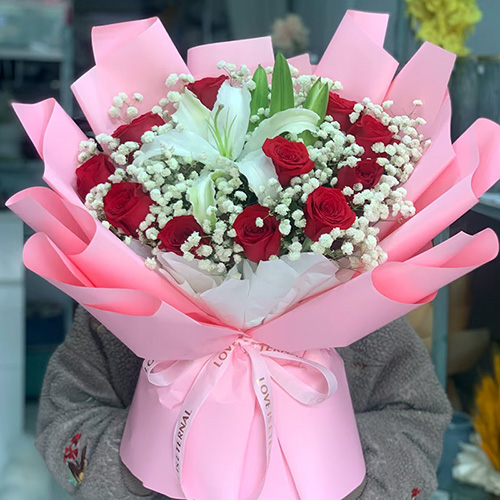 • 【不负韶华】红玫瑰、粉玫瑰混搭共11朵,白色、粉色多头香水百合共8支,搭配洋桔梗、尤加利叶装饰。