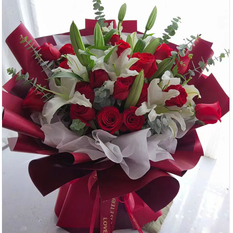 花材: 19朵精品红玫瑰,3支多头白色香水百合,搭配尤加利叶间插。