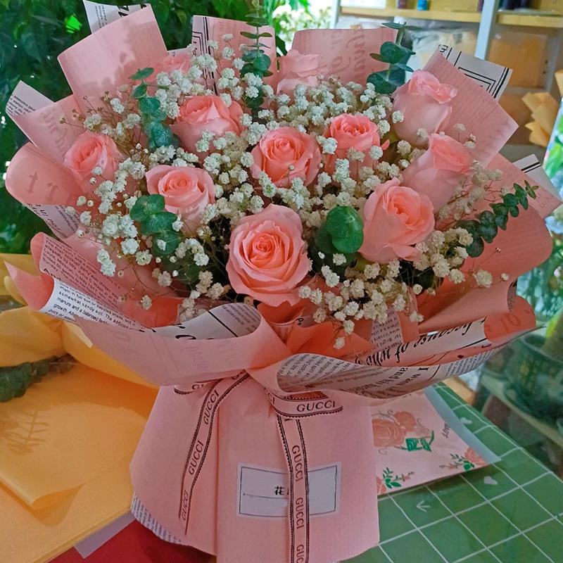 花 材:11枝粉玫瑰,搭配白色满天星、尤加利叶丰满间插。