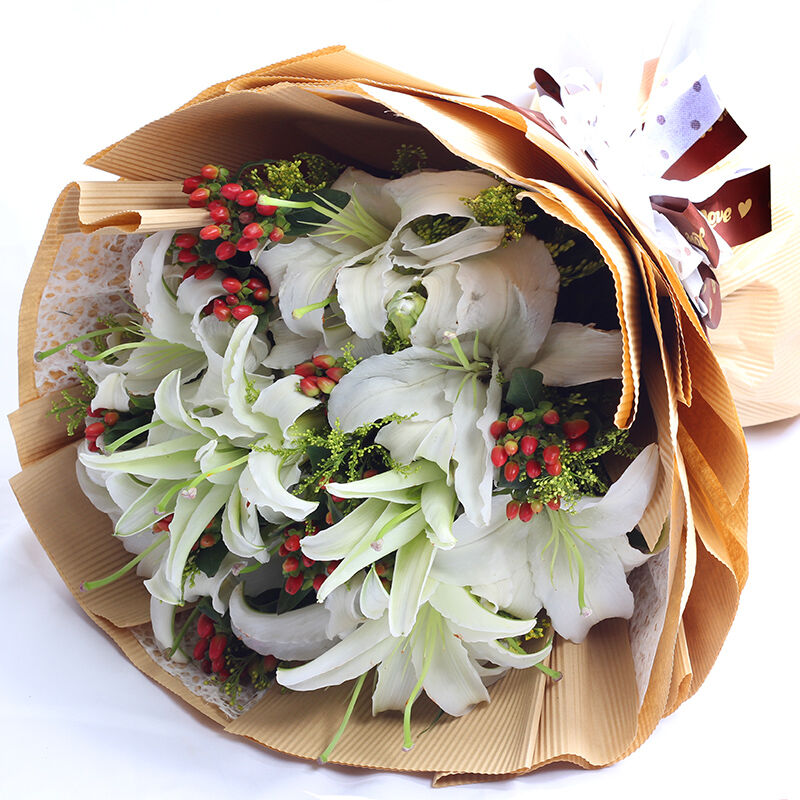 花材: 精选11朵香水百合,搭配相思豆、黄莺点缀。