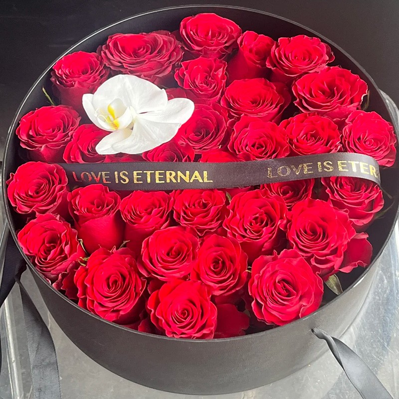 花 材:精选33枝红玫瑰,1朵蝴蝶兰,黑色英文缎带装饰花面。