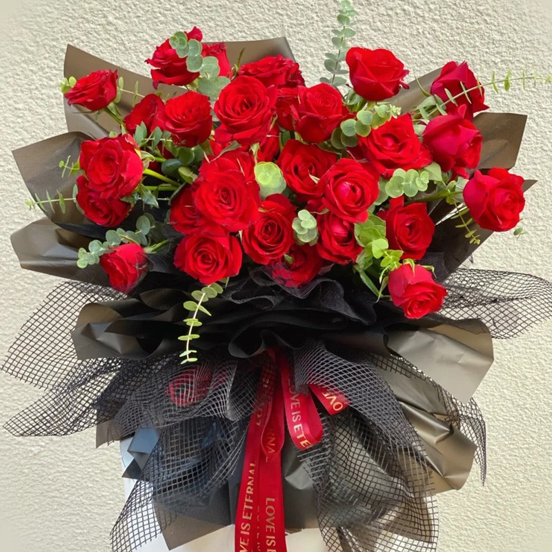 花材: 33朵红玫瑰,尤加利叶间插装饰。