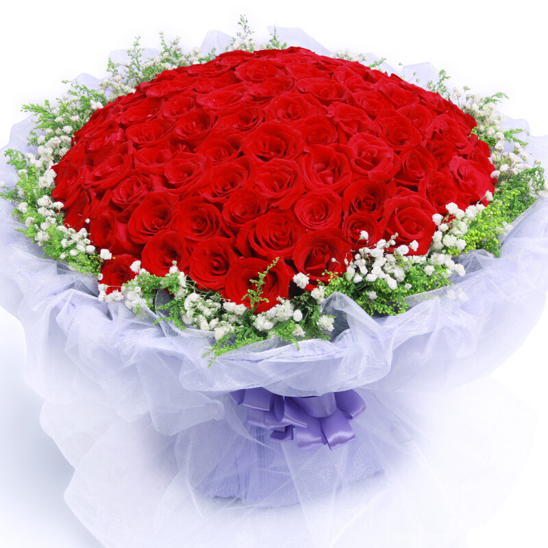 花 材:精选顶级99朵红玫瑰,黄莺、满天星围绕。