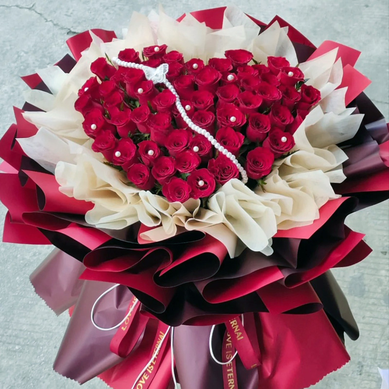 花 材:精心挑选52朵红玫瑰,1条珠串,珍珠工艺品装饰花面。