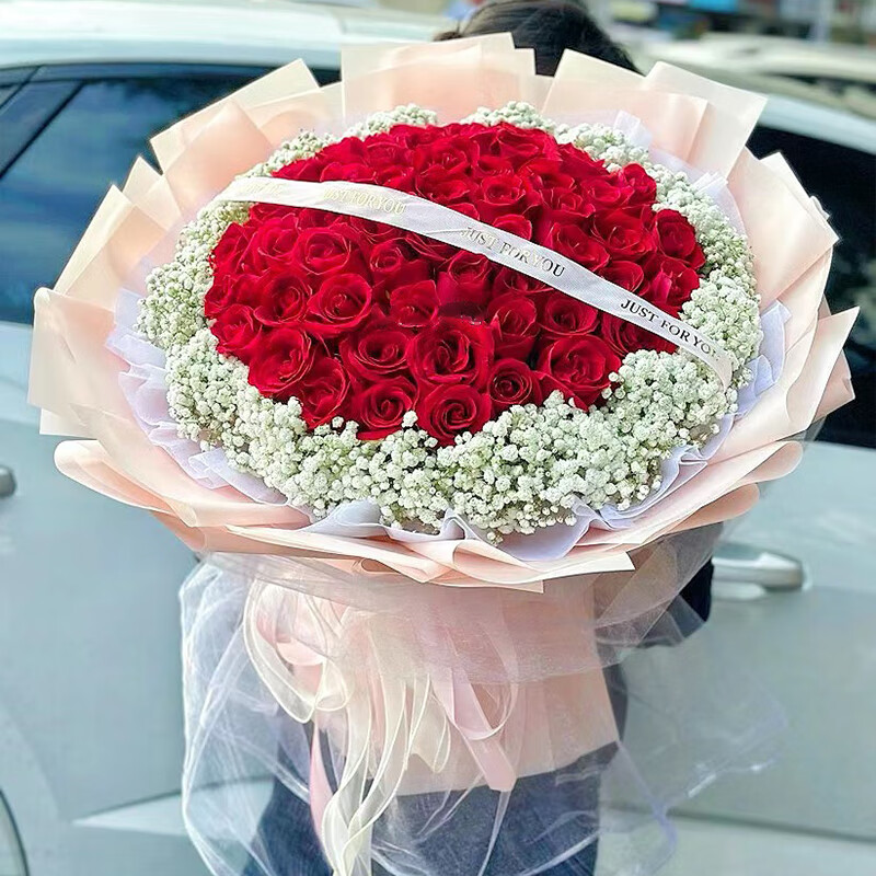花材: 精选52朵红玫瑰,白色满天星外围环绕,白色英文缎带装饰花面。