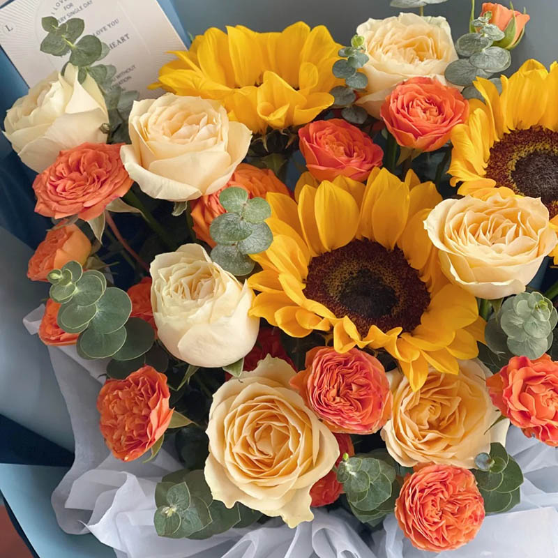 花 材:3支向日葵,8朵香槟色玫瑰,搭配5支橙色多头小玫瑰(断货则用5支洋桔梗代替),尤加利叶间插装饰。