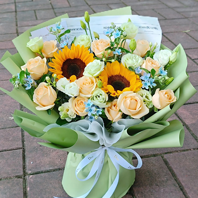 花材: 2朵向日葵,11朵香槟玫瑰,5支洋桔梗,搭配蓝星花装饰。(蓝星花为季节性花材,非应季则替换为其他配花来保证花束效果)