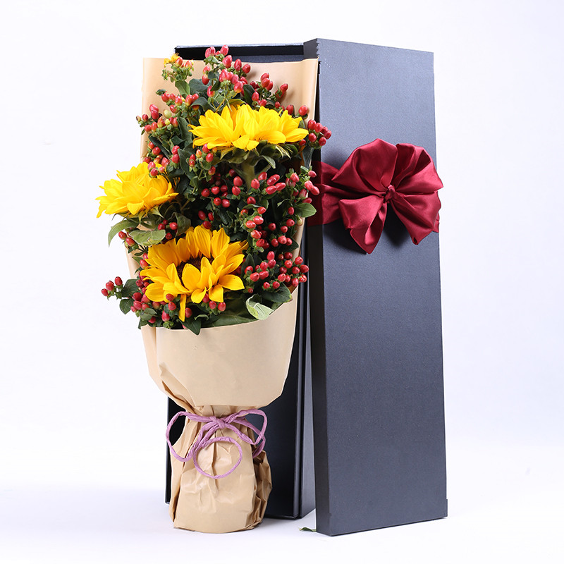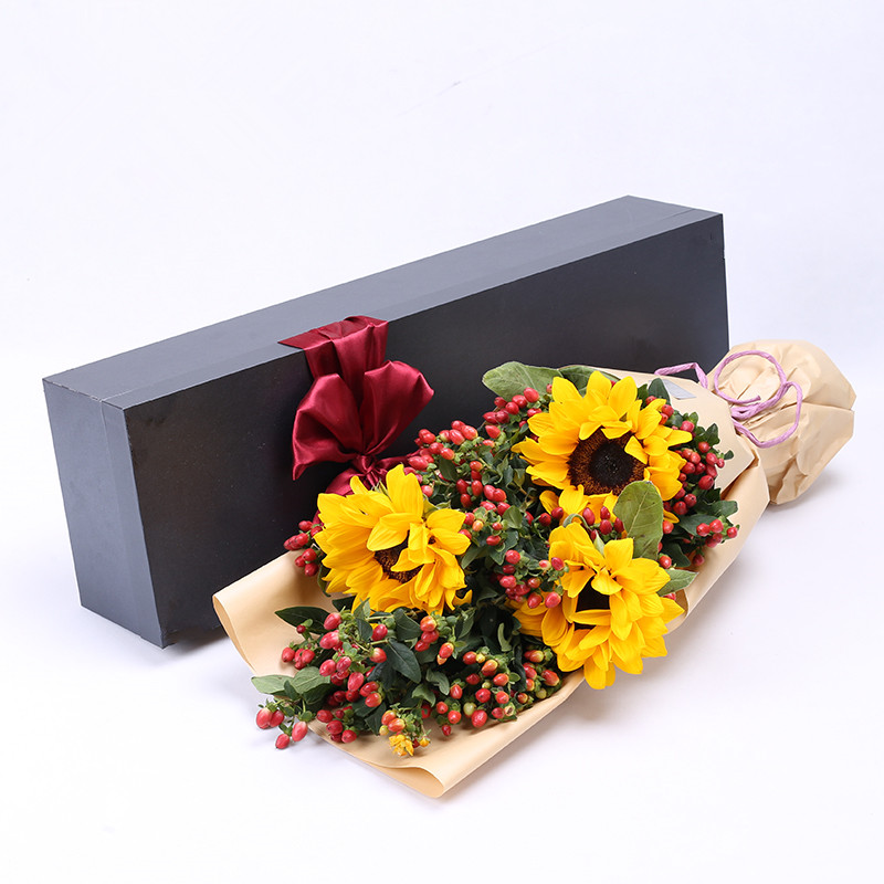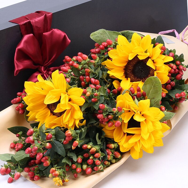 花材: 3支向日葵,整扎红豆丰满包扎。