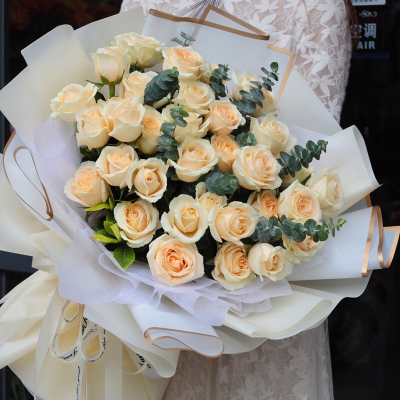 花材: 33朵精品香槟玫瑰,尤加利叶装饰。