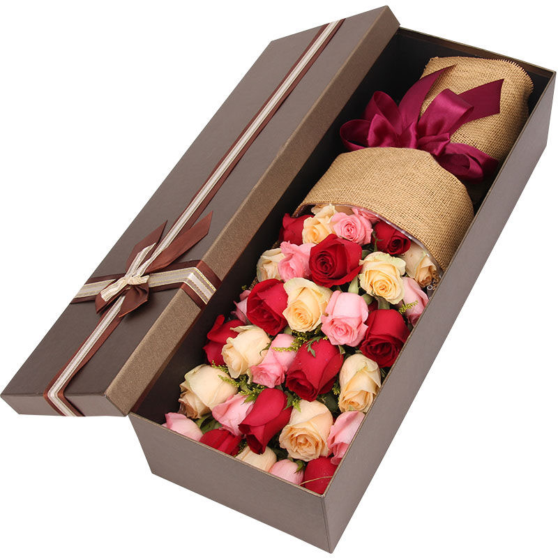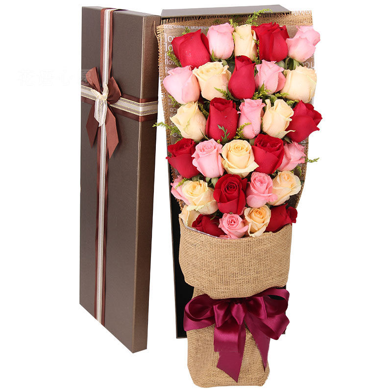 花 材: 11朵红玫瑰,11朵香槟玫瑰,11朵粉玫瑰共33朵,黄莺搭配。