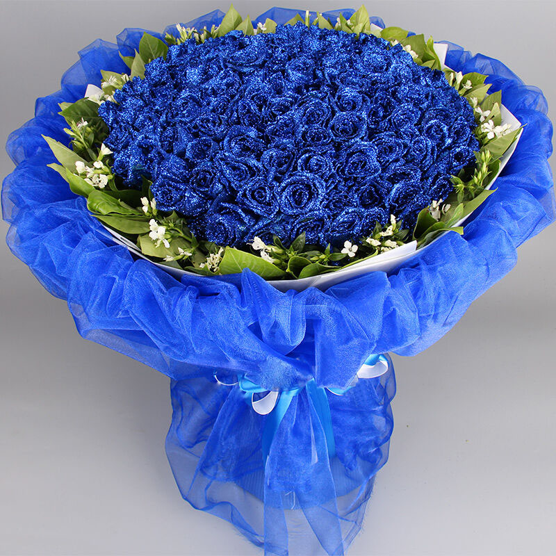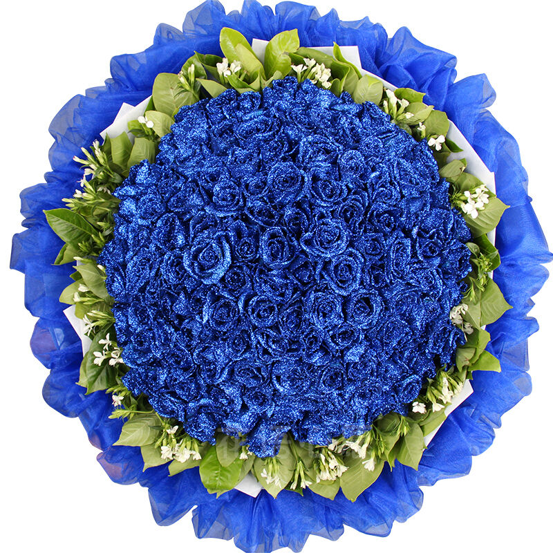 花 材:99朵蓝玫瑰,栀子叶,相思梅围绕。