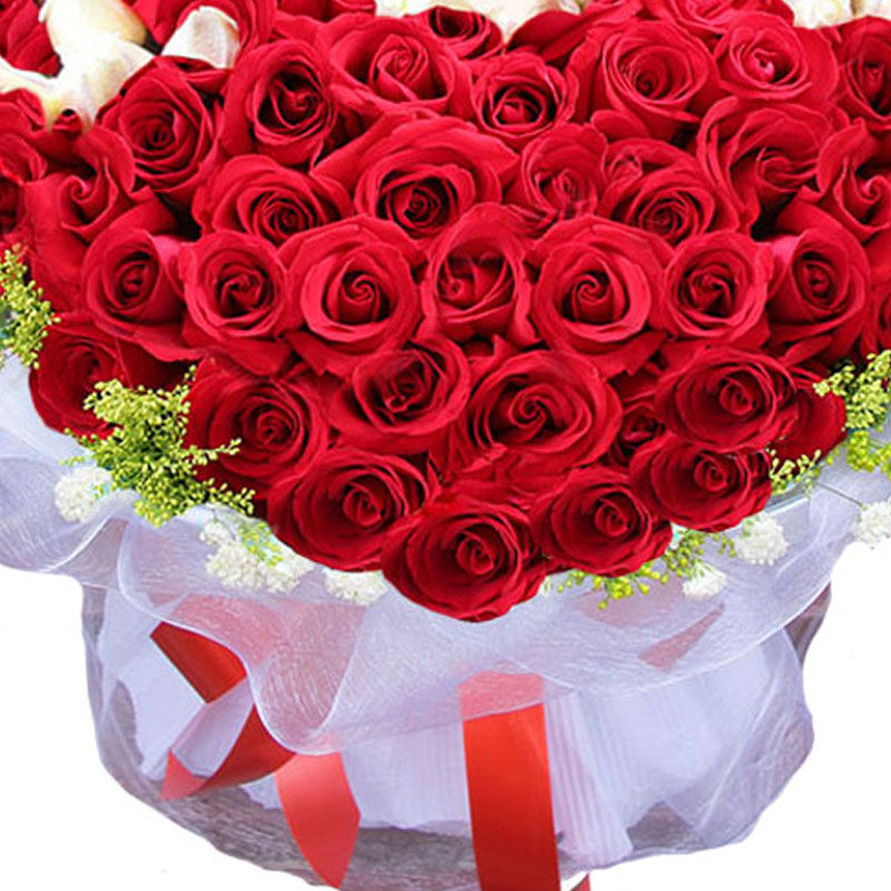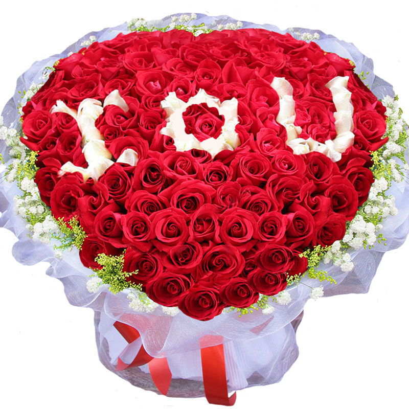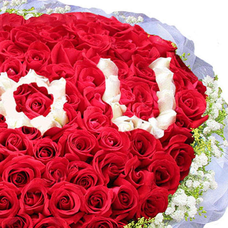 花材: 精选红玫瑰、白玫瑰共99枝,白玫瑰中间围成IOU的图案,外围满天星黄莺点缀。