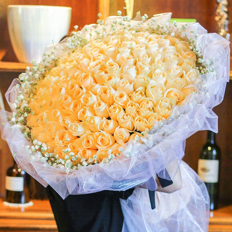 花材: 精选99朵顶级香槟玫瑰,白色满天星环绕。