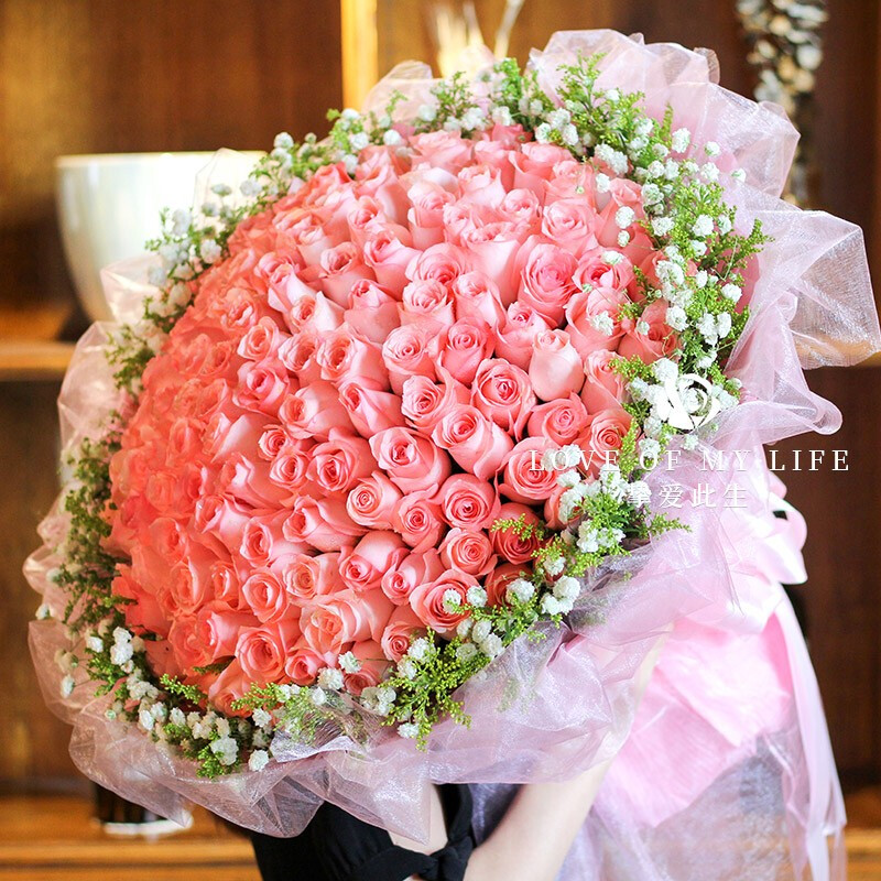 花 材:99朵精品粉玫瑰,搭配黄莺草、满天星外围环绕。
