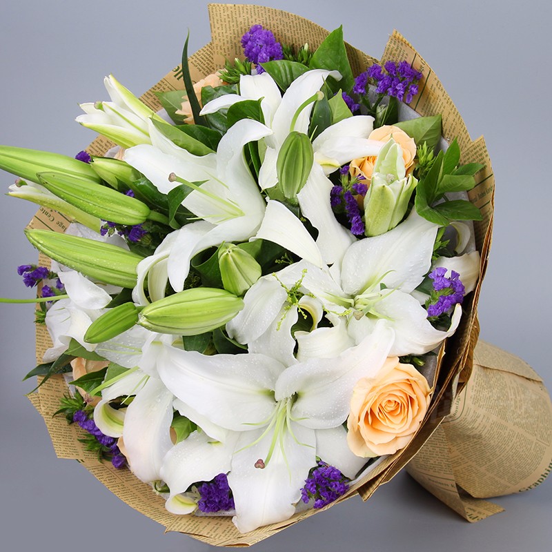 花 材:6支香槟玫瑰,5支多头白百合,搭配适量紫色勿忘我、栀子叶、白色相思梅。