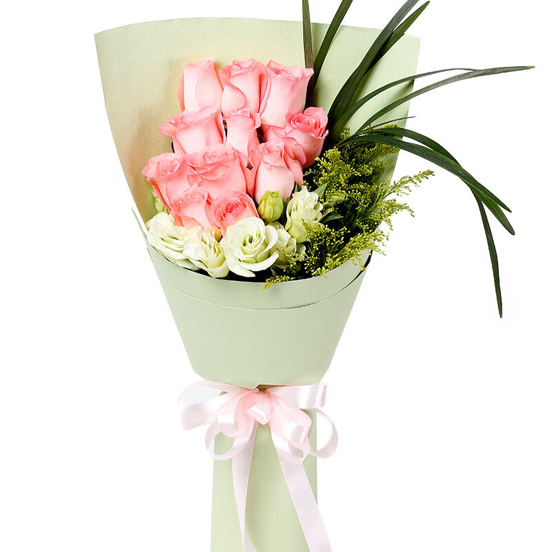 花材: 11支精品粉玫瑰,搭配适量白色洋桔梗、黄莺、书带草。