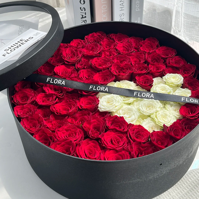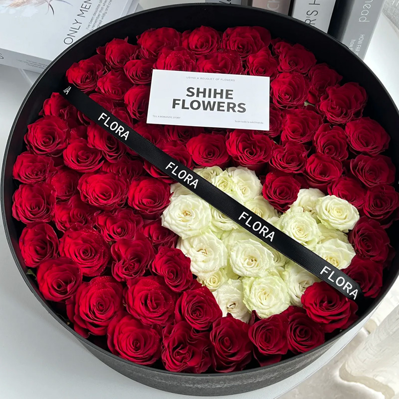 花 材:精选60枝红玫瑰,15枝白玫瑰(白玫瑰心形造型),一条缎带装饰花面。
