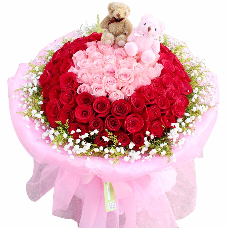 花材: 99支精品混色玫瑰(红玫瑰、粉玫瑰)+2只可爱小熊,搭配适量白色满天星、黄莺。